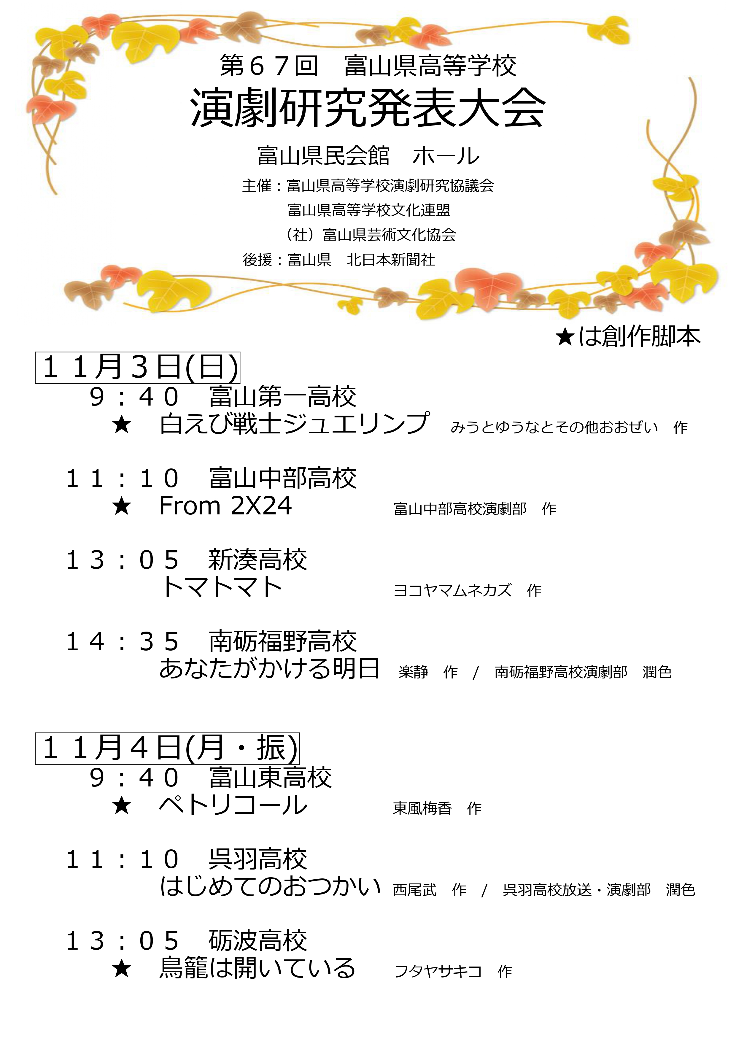 | 2025 10/25(土)-26(日) | 第68回富山県高等学校演劇大会 会場:富山県教育文化会館 【最優秀賞】 新湊高校 【優秀賞】 富山第一高校 呉羽高校 【創作脚本賞】 富山中部高校 【奨励賞】 砺波高校 富山中部高校 高岡工芸高校 |